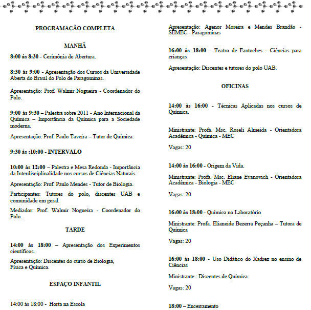 Os discentes dos cursos de Ciências Naturais - Biologia, Química e Física terão a oportunidade de demonstrar os conhecimentos adquiridos durante o andamento dos cursos, através de experimentos científicos de baixo orçamento relacionados à Química, que serão apresentados à comunidade em geral. Este evento será fundamental para a divulgação científica e a interdisciplinalidade didática no município de Paragominas.